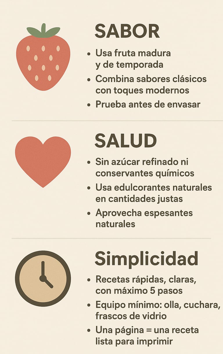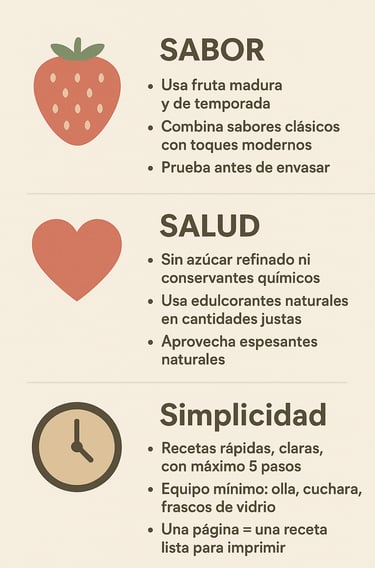 Todas las recetas de este guía siguen un principio sencillo: el Método 3S. Estas son tus reglas de oro para que cada frasco de mermelada salga delicioso, saludable y fácil de preparar.